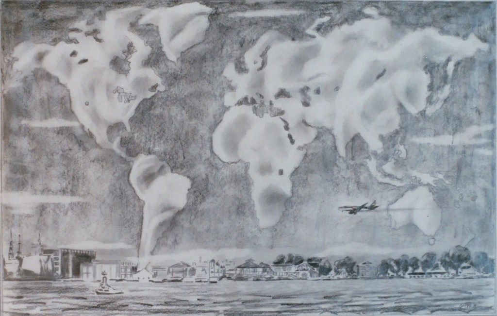 Our Partnerships Succeed This is one of a pair of pencil sketches submitted for a commission in 2005. I was asked to create a pair of 7’ wide oil paintings for the corporate boardroom of an import/export agency located in Philadelphia's Navy Yard. I chose to illustrate the seven continents as cloud formations drifting above the Navy Yard skyline. Air, sea and land transportation command the lower third of the artwork.