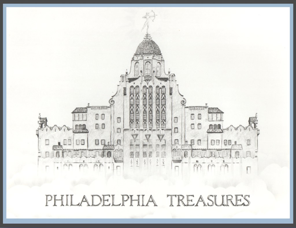 In this 17" x 25" drawing, I chose to float the building's astonishing Moorish crown above the clouds, and imported Diana, Goddess of The Hunt, from The Philadelphia Museum Of Art. She conjures as a whiff of smoke, offering a hope and prayer that someone with money and good taste might invest in the building.