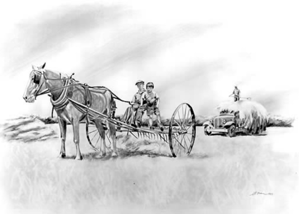 The Hartman Generations Jim Hartman was a little Pennsylvania boy hitching a ride on his grandfather's haymow in the mid-1940s. His dad can be seen in the background standing atop the hay truck. In the mid 1980s, pancreatic cancer was taking its toll on Jim. He showed me an old WPA photograph of this scene, telling me all about Ned the horse. I asked to borrow the photo, and created the 17' x 25" drawing for him. Framed and hung over the mantel in his living room, it kept him company until he passed.