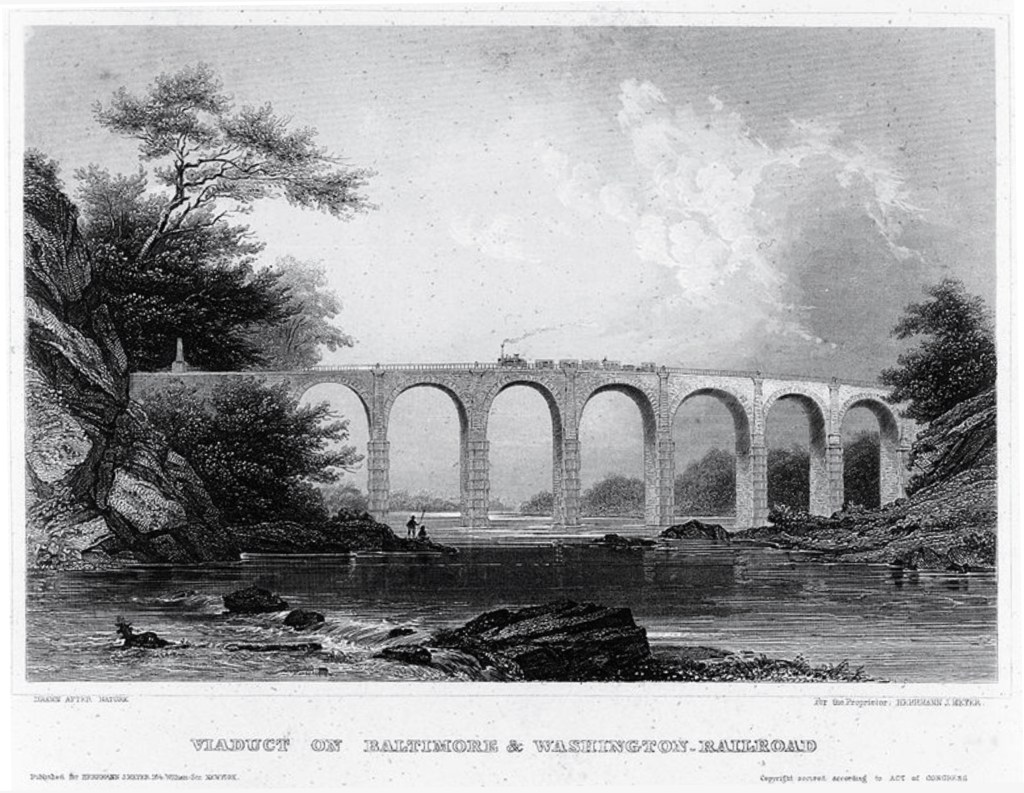 VIADUCT ON BALTIMORE & WASHINGTON RAILROAD renamed Thomas Viaduct, honoring Philip E. Thomas, who was first to serve as CEO of the Baltimore & Ohio Railroad.
