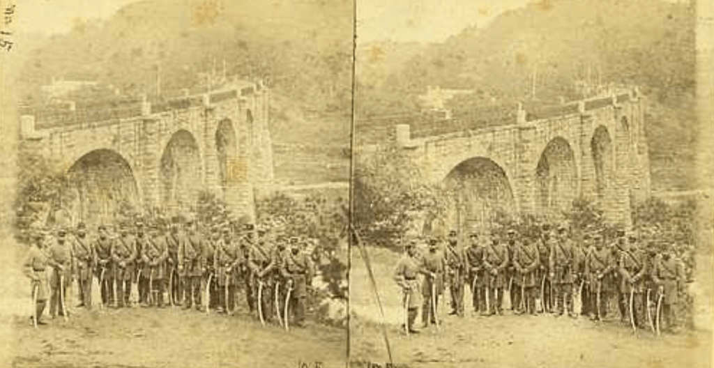 Of special note in the stereoscopic image above, the height of the viaduct arches can be gauged by focusing on the light reflecting on the base of the third arch from the left. Imagine how much silt has filled the river bed, covering almost half of the height of each arch. This vast layer of sedimentation and the attendant vegetation that took root and spread would eventually negate the ebb and flow of tidal waters that, only two centuries before, Captain John Smith had actually navigated a half mile upstream from this location to the mouth of Rockburn Branch. The Colonial Port of Elkridge also became unnavigable due to a century of careless dumping of ballast. Downstream along the Patapsco River, Baltimore emerged as the preferred harbor, with deeper waters and more sustainable shipping practices contributing to its ultimate success.