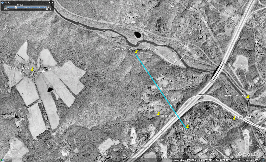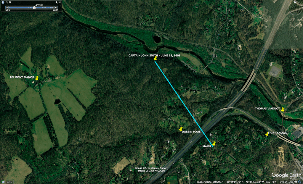 Pinned in these Google Earth screenshots, GPS: (39.2278, -76.7297) are the coordinates of Captain John Smith’s visit on June 13, 1608, a half mile from Lawyers Hill and my parents’ house. Note that the Patapsco riverbed had once been a full 500′ wide and deep enough to receive Smith’s shallop. The good captain’s skills as a cartographer are astounding!