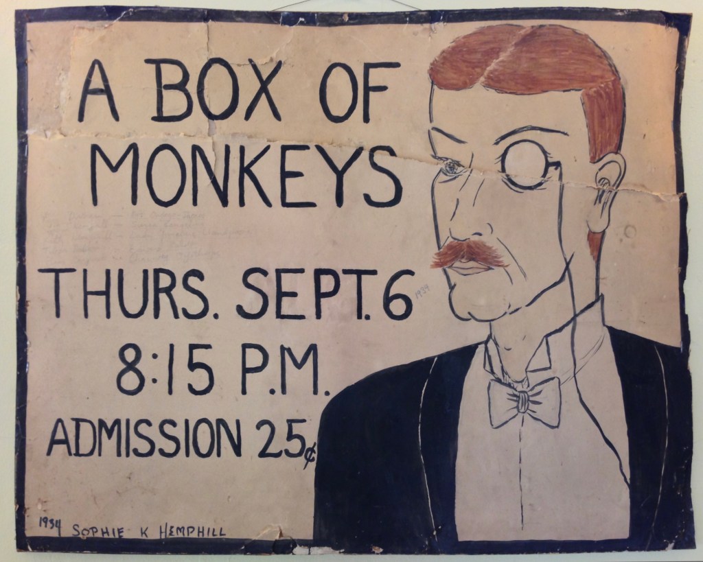 This poster was created for The Hall in 1934 by Lawyers Hill resident Sophie K. Hemphill. A Victorian play published in 1889 as “A Parlor Farce”, it’s downloadable here in pdf format, courtesy of The Library of Congress: A BOX OF MONKEYS