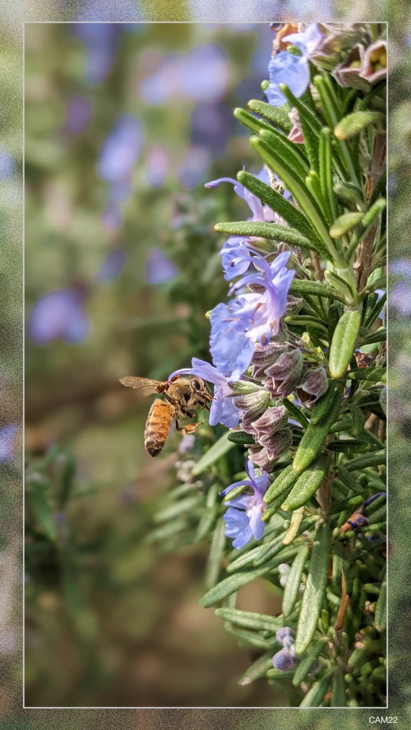 Bee Haven Florence Italy 2022 This chance digital photograph was brought about by a magical moment paired with even more magical technology. In Florence Italy, I was touring Giardino della rose, part of Piazzale Michelangelo, which holds court high above the city. The area was full of tourists, and the garden steps that I was navigating included dozens of like-minded individuals jostling through the narrow spaces crowded with gorgeous plantings. I caught a glimpse of bees buzzing around the flower blossoms, and held my place firmly on the descending staircase, leaning into the railing, hoping that I would capture a little bit of Italian nature. The results, snapped in Portrait Mode, are a better scene than I could have imagined on my own.
