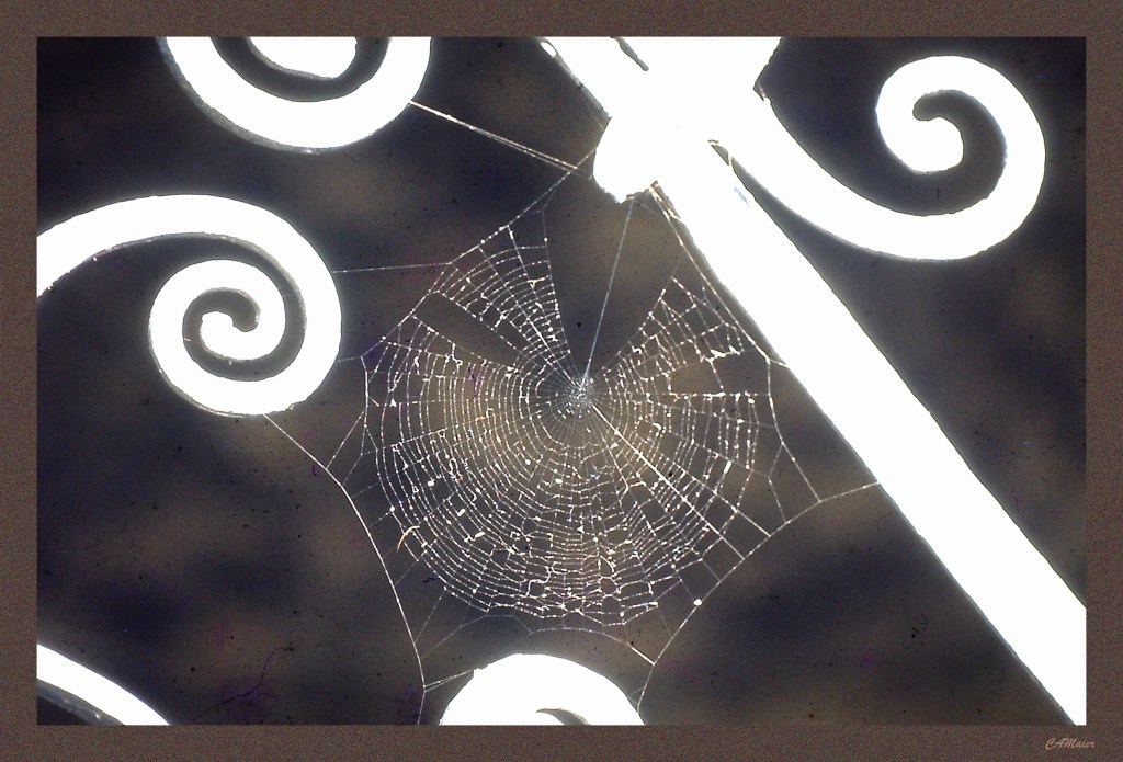 Touching Burgos, Spain, 1971: One of my earliest photographs, it existed as a Kodachrome slide until I revisited my collection a decade ago and digitized the best of the lot. I recall that the wrought iron was painted black. But the bright sunlight against the even darker background caused the tone inversion, allowing the spider web to be captured beautifully.